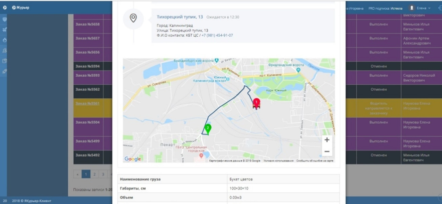 С момента назначения водителя на заказ Вы можете отслеживать его перемещение на карте. При клике в списке заказов на номер заказа, откроется всплывающее окно с данными заказа, а также поле-карта с отображением машины на маршруте.